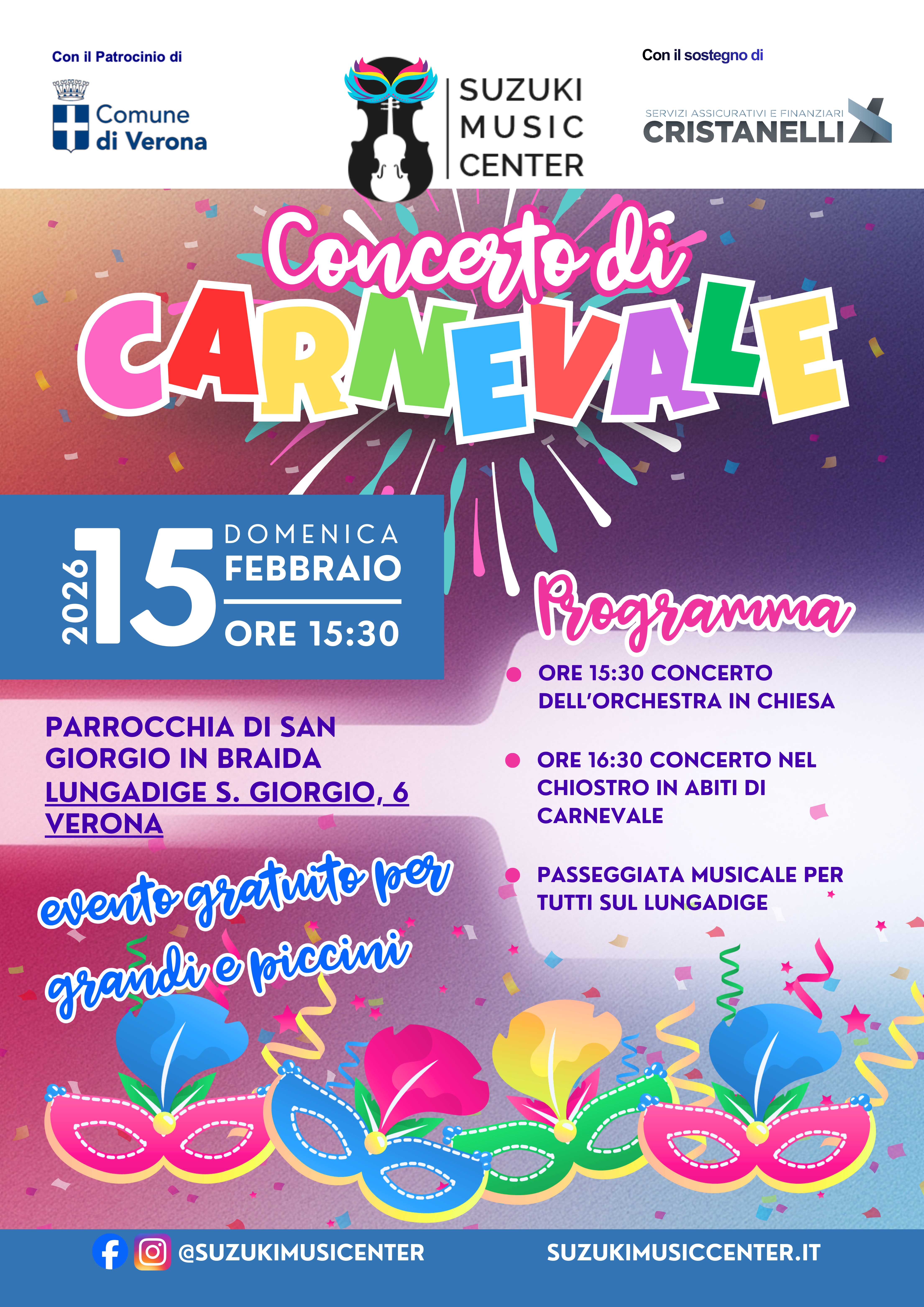 Domenica 15 febbraio 2026, il Suzuki Music Center, scuola di musica con sedi a Bologna, Parma e Negrar i Valpolicella, invita la città di Verona a un evento speciale: il Concerto di Carnevale, un pomeriggio di musica dal vivo, gratuito, pensato per bambini, famiglie e appassionati di musica.